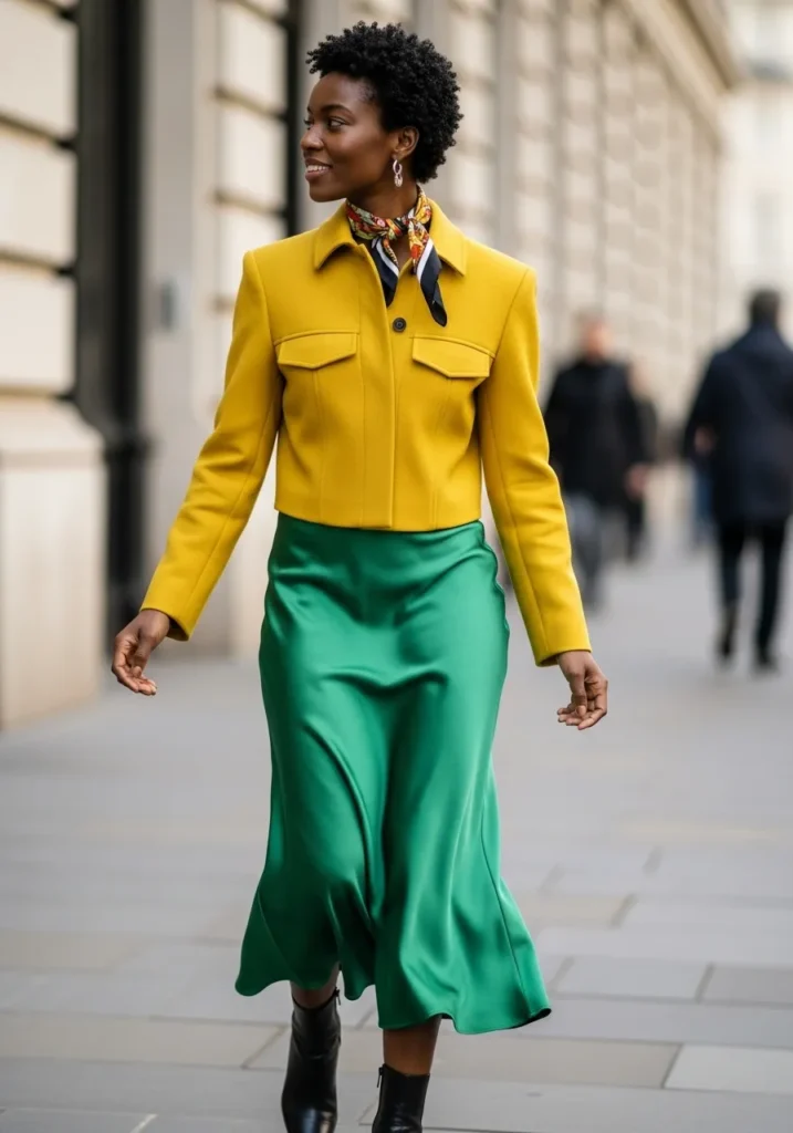 This outfit brings serious personality with a mustard yellow structured jacket paired with a flowing green satin midi skirt. The silky fabric moves beautifully while the cropped jacket keeps everything sharp and intentional. A patterned neck scarf adds a fun detail that feels very fashion forward.