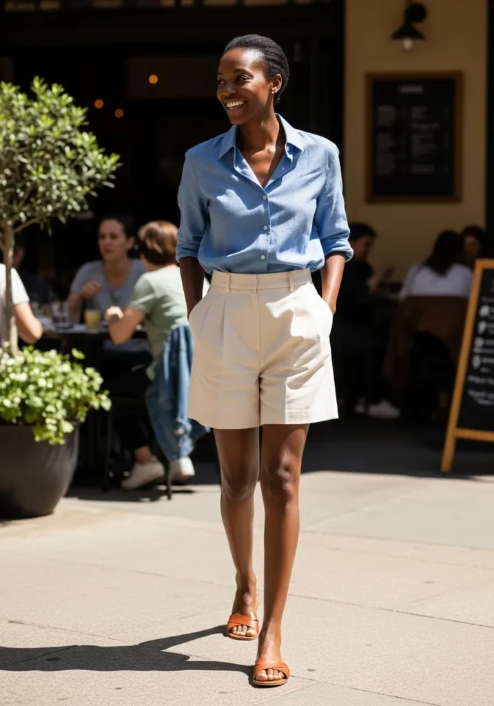This look combines a light blue button down shirt with tailored cream shorts for an easy warm weather vibe. The relaxed fit of the shirt keeps things casual while the structured shorts add balance. Simple sandals finish the look with an effortless touch.