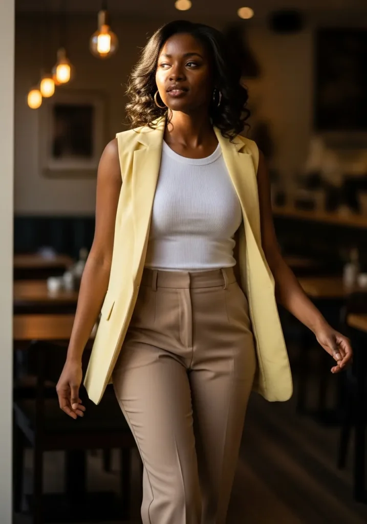 This outfit layers a sleeveless pastel yellow vest over a fitted white tank paired with neutral tailored trousers. The clean lines and soft colors give this look a modern minimal feel. Everything fits smoothly and feels very wearable.