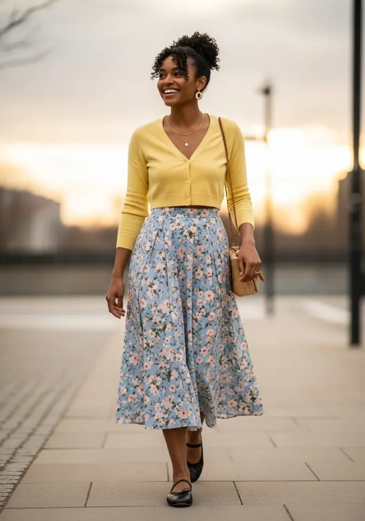 This look pairs a cropped yellow cardigan with a breezy floral midi skirt. The light fabrics and soft prints feel playful and romantic while still being polished. Finished with simple flats and a woven bag it feels very spring ready.