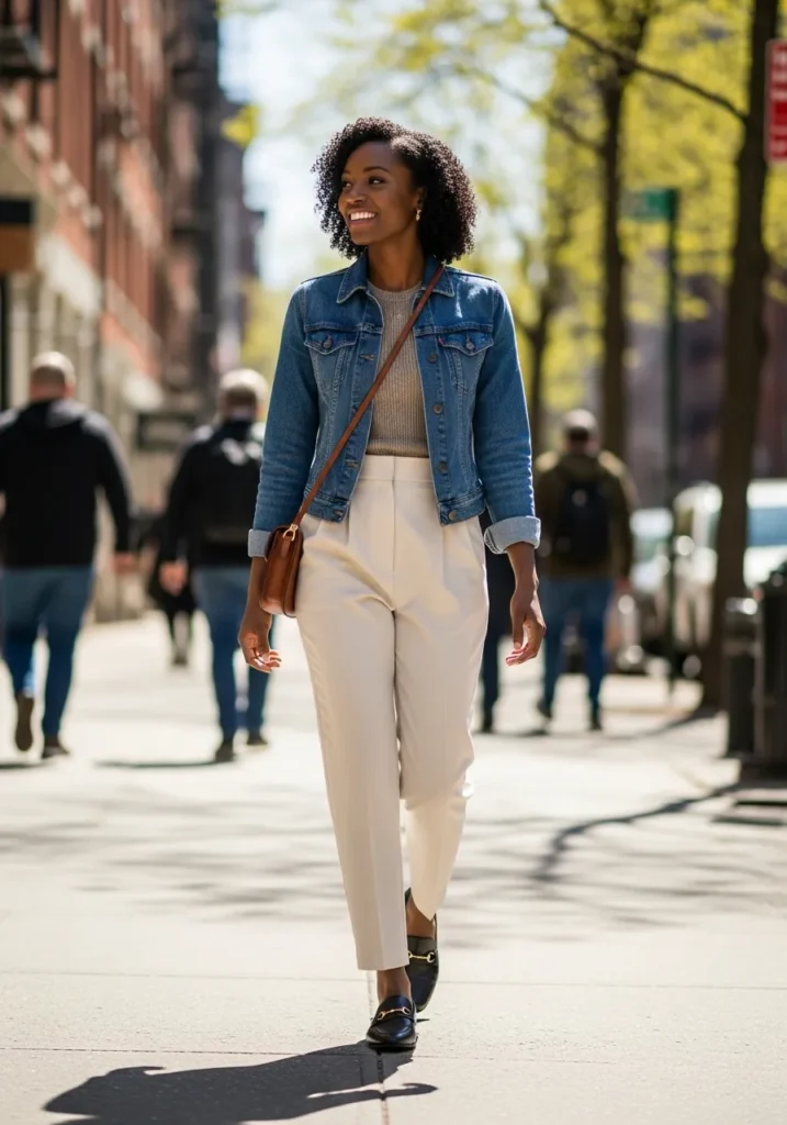 This outfit layers a classic denim jacket over a neutral top and crisp white trousers. The structured denim adds contrast while the clean pants keep the look fresh and modern. A crossbody bag ties everything together.
