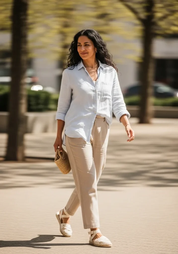 Here we see a light blue linen button down paired with beige tailored trousers for a fresh and airy look. The shirt is worn casually with sleeves rolled up, while the trousers have a clean and relaxed fit. White espadrille style flats and a woven clutch complete the look with subtle texture.