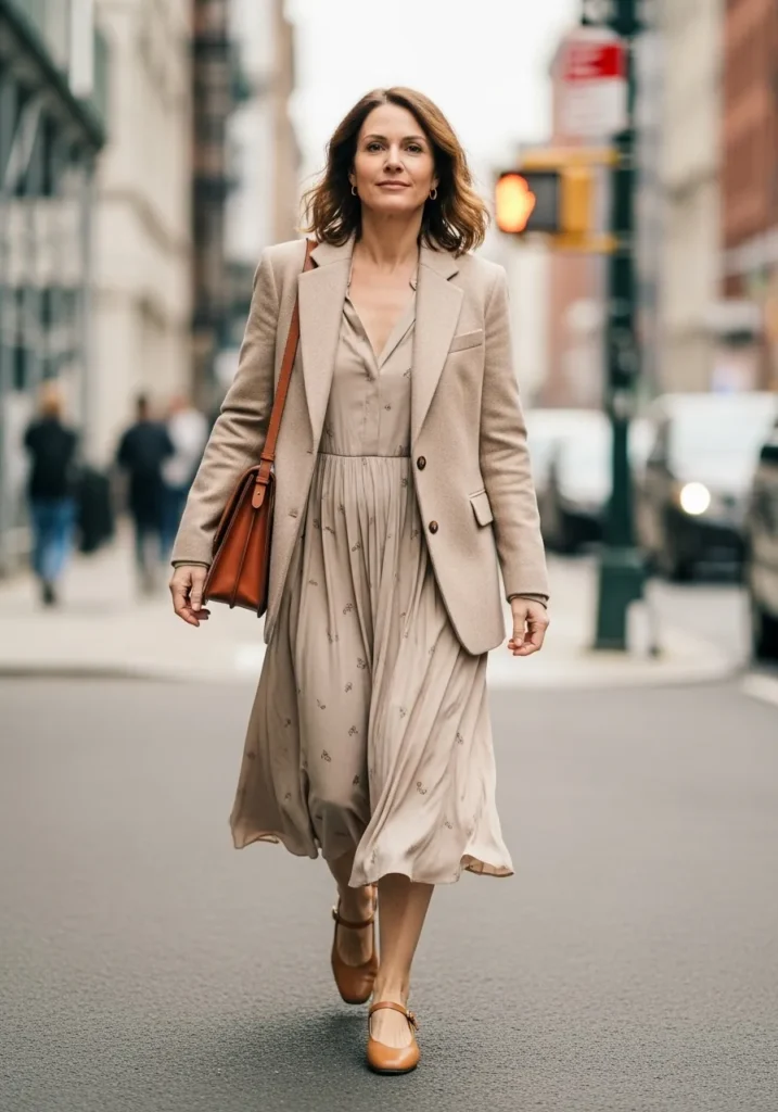 This outfit layers a tailored beige blazer over a soft flowing midi dress in a matching neutral tone. The dress has a gentle drape that moves beautifully, while the blazer adds structure and polish. Tan flats and a coordinating leather bag keep the look cohesive and city ready.