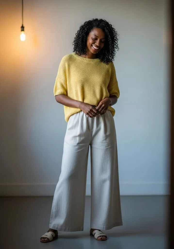 This outfit features a loose yellow knit top paired with wide leg off white pants. The knit has an easy drape, and the pants fall straight for a clean and modern silhouette. Simple sandals keep the look light and breathable.