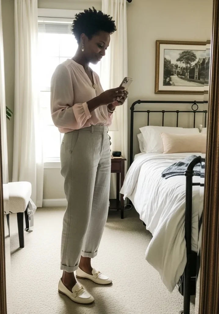 This outfit pairs a light blush blouse with tailored beige trousers that hit just above the ankle. The fabric feels airy and soft, while the structured waistband keeps the look clean and refined. Finished with classic white loafers and simple jewelry, everything feels calm, minimal, and intentionally put together.