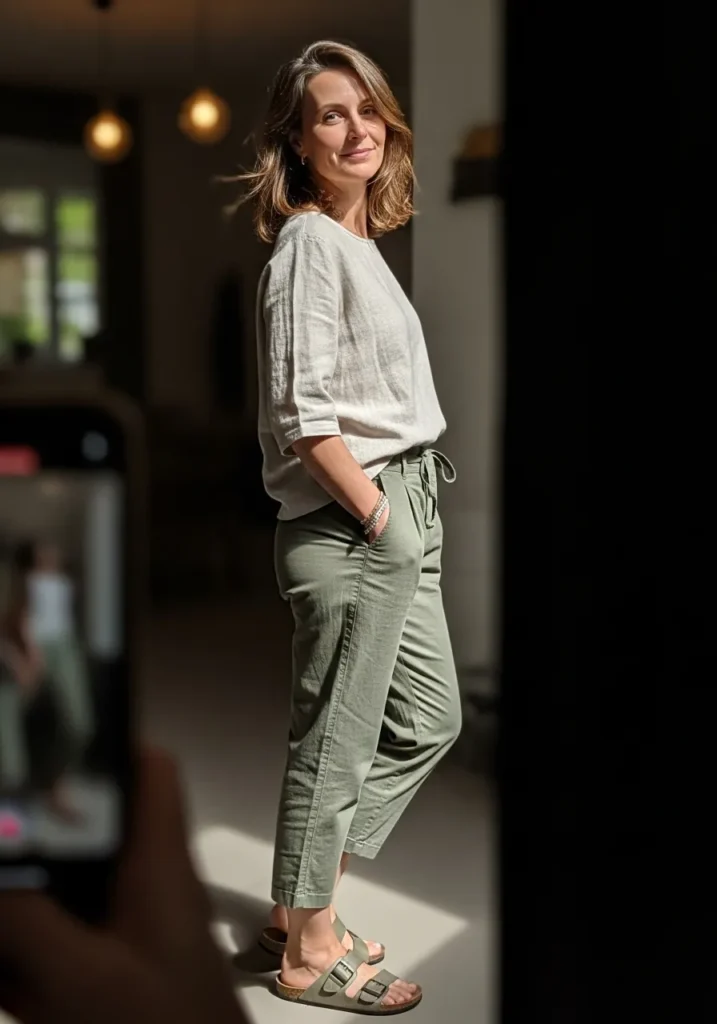 A lightweight neutral top is tucked into olive green drawstring pants with a relaxed fit. The fabric looks breathable and soft, styled with flat sandals that keep everything effortless. The earthy tones feel calm and grounded.