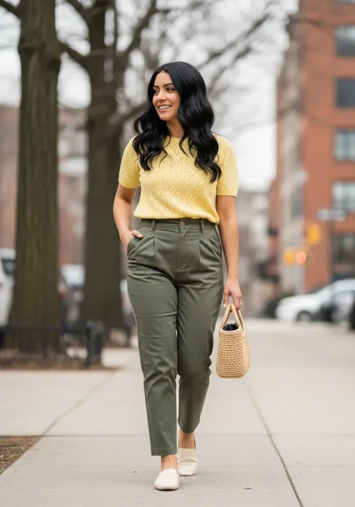 A soft yellow short sleeve top adds a cheerful touch when paired with tailored green trousers. The pants offer structure without stiffness, while neutral flats and a woven bag keep things easy and wearable. The color combination feels fresh and light.