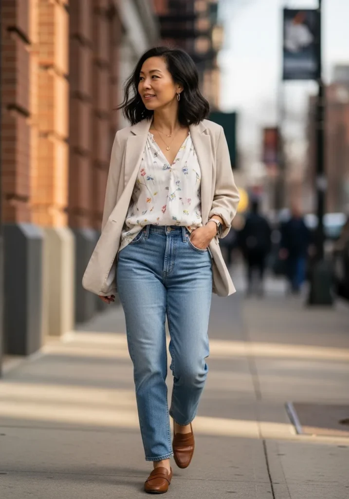 A light beige blazer is layered over a delicate floral blouse and classic blue jeans. The fit feels relaxed but polished, finished with loafers that ground the look. Everything stays soft, neutral, and well balanced.