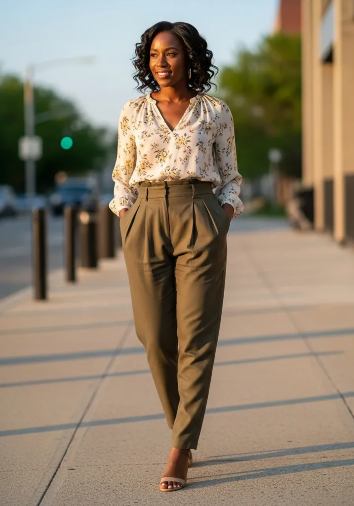 A flowy floral blouse is tucked into high waisted olive trousers with a clean tailored shape. The softness of the print contrasts beautifully with the structured pants, creating a flattering silhouette. Simple heels add a touch of polish.