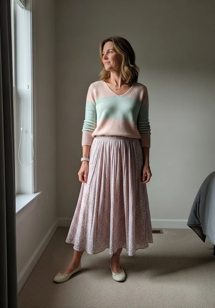 A soft pastel knit sweater pairs beautifully with a light floral midi skirt. The textures feel gentle and romantic, finished with neutral flats that keep the look grounded. Everything about this outfit feels airy and calm.