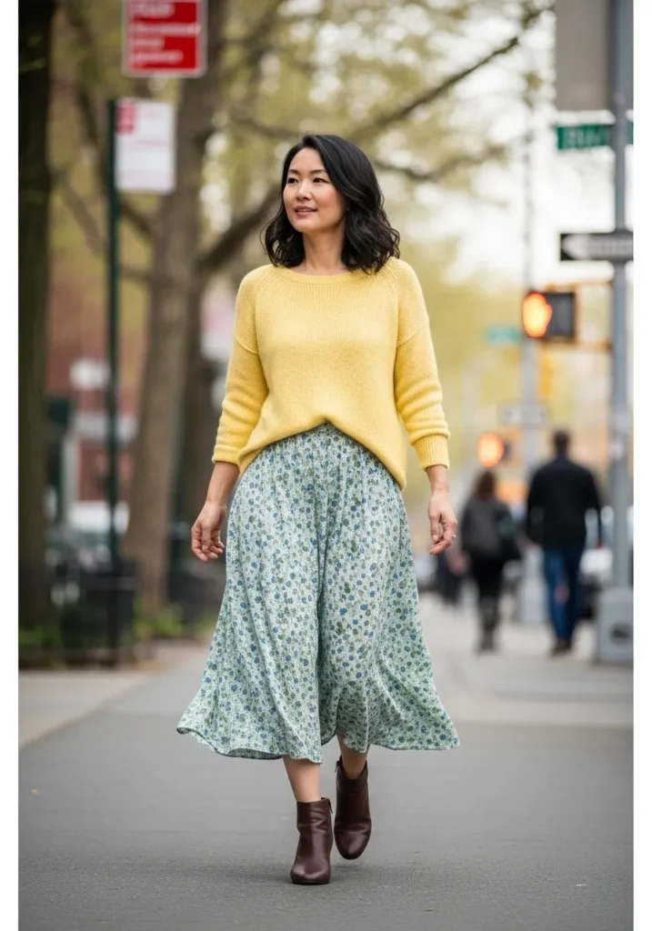 A buttery yellow knit sweater sits effortlessly over a breezy floral midi skirt with soft movement. The textures feel light and comfortable, and ankle boots ground the look just enough. The overall vibe feels cheerful, calm, and easy to wear.