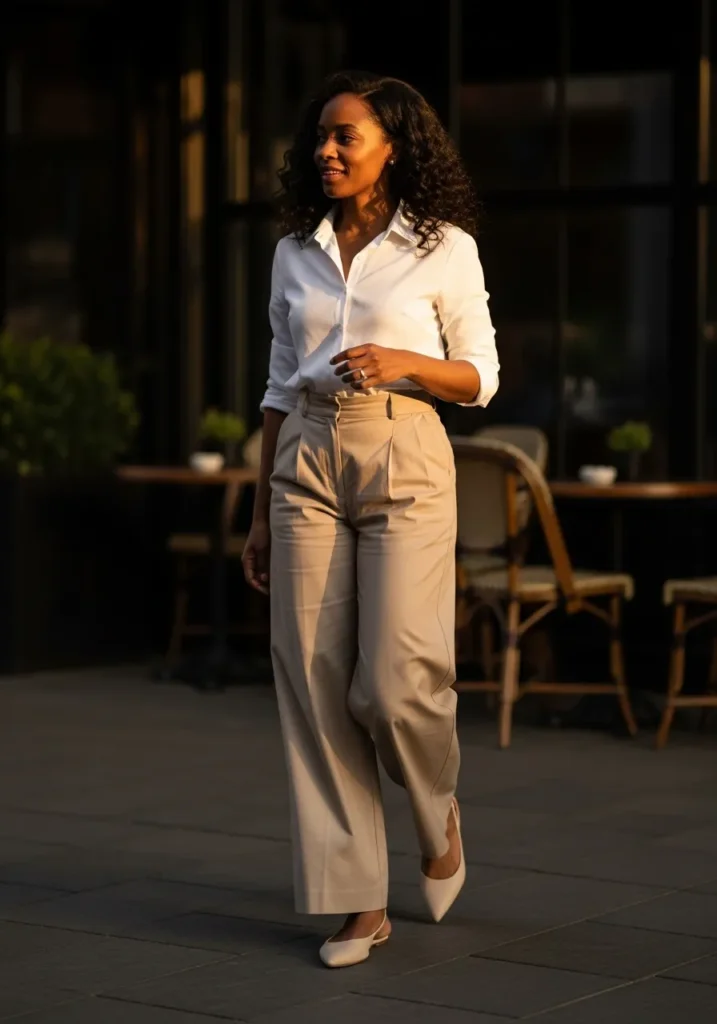 I love outfits like this because they feel powerful in a quiet way. A good white shirt always makes me feel put together, even on busy days. It’s simple, flattering, and endlessly wearable.