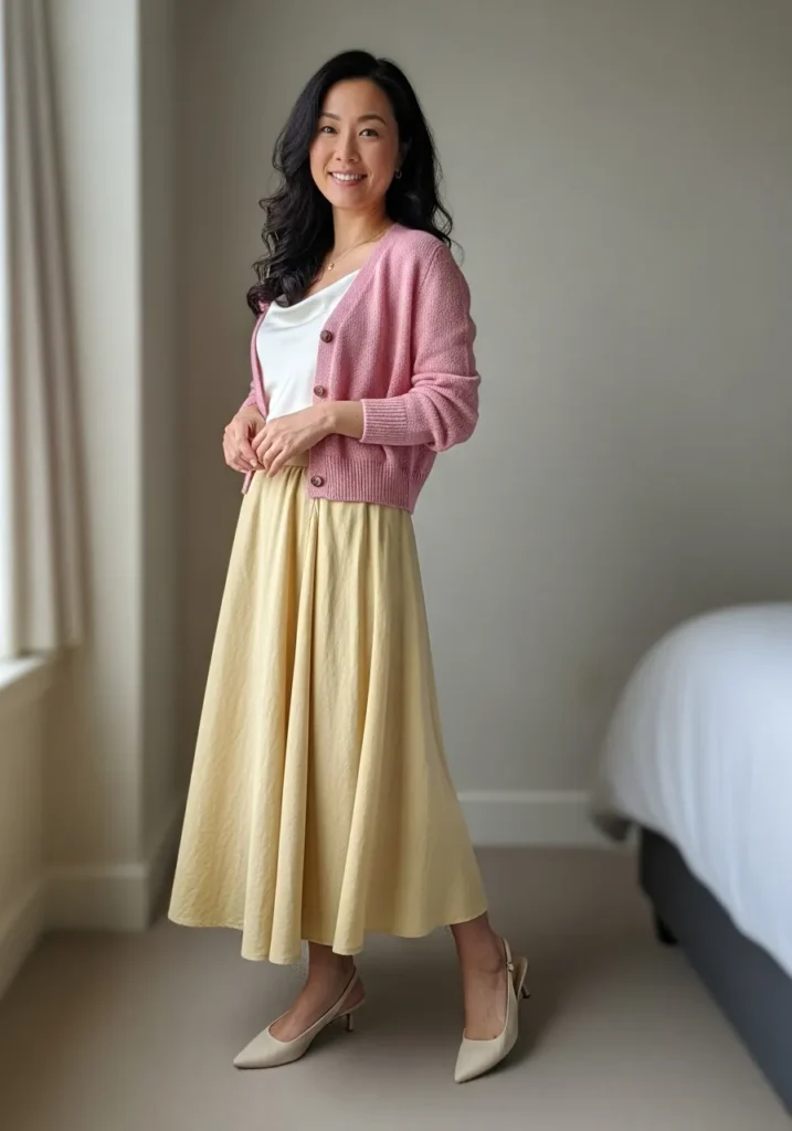 A cozy pink cardigan is layered over a simple white top and paired with a light flowing midi skirt. The fabrics feel gentle and airy, perfect for spring days indoors or out. Neutral heels add a subtle polished touch.
