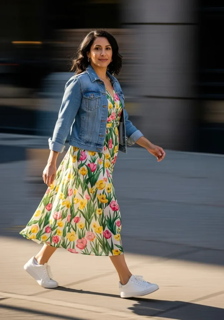 A colorful floral midi dress brings movement and energy, layered with a classic denim jacket for balance. White sneakers keep the look playful and wearable. The contrast between feminine and casual feels fresh.
