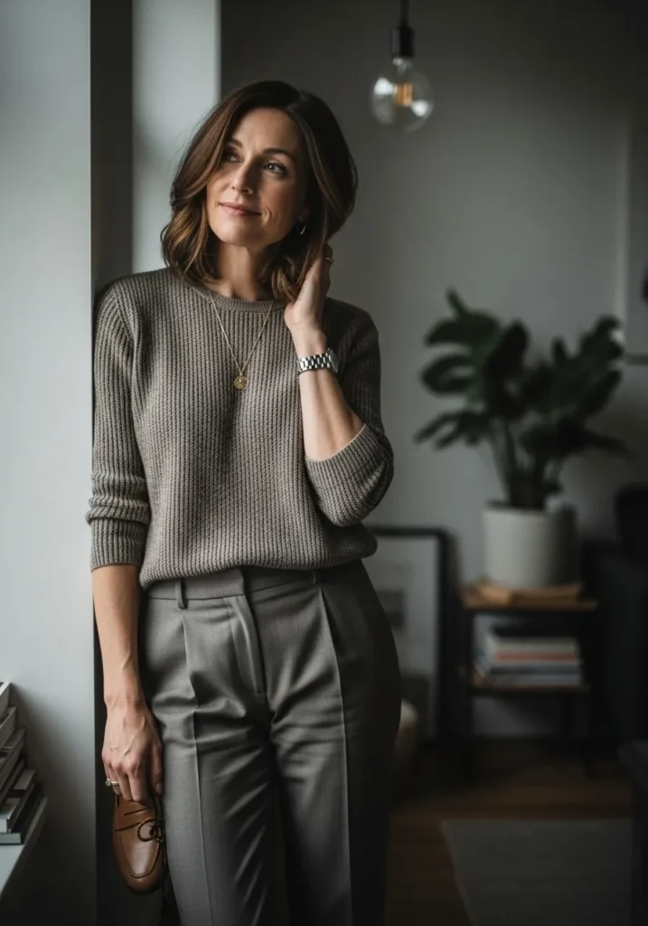 A soft neutral knit sweater is paired with tailored gray trousers for a relaxed but refined look. The textures feel cozy, while the clean lines keep everything intentional. Minimal accessories complete the outfit.
