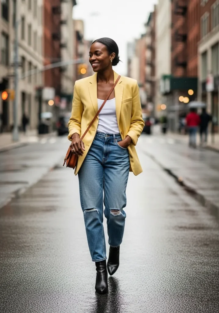 A sunny yellow blazer is layered over a white tank and classic blue jeans. The structured blazer adds sharpness, while the denim keeps it casual. Black ankle boots bring a slightly bold finish.
