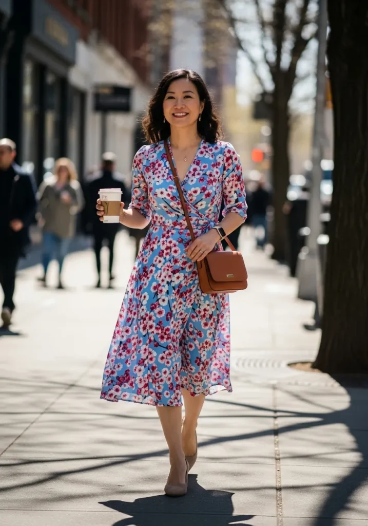 This look features a soft blue wrap dress covered in delicate pink florals, finished with a flattering V neckline and flowy midi length. The fabric looks light and breathable, perfect for spring days. Nude heels keep it polished, while a warm brown crossbody bag and a takeaway coffee add an effortless city vibe.
