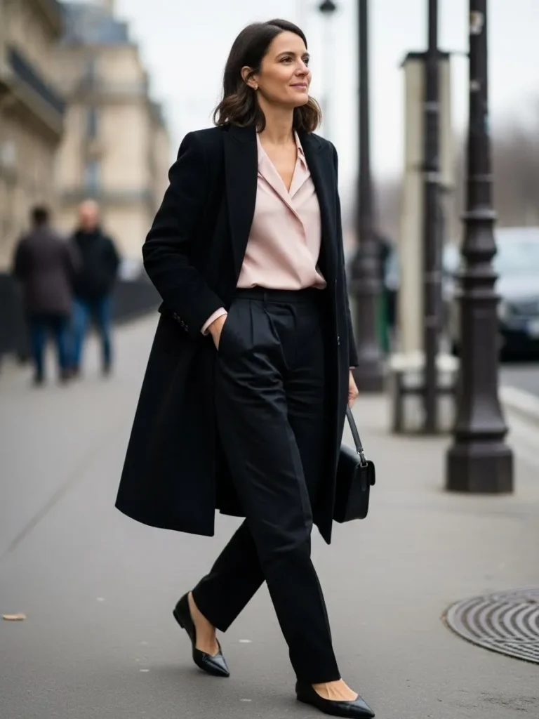 This look features a blush blouse layered under a sharp black coat with tailored black pants and pointed flats.