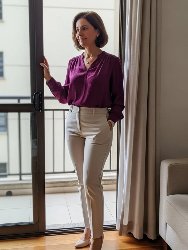 This outfit features a plum blouse tucked into light beige tailored trousers with neutral heels.