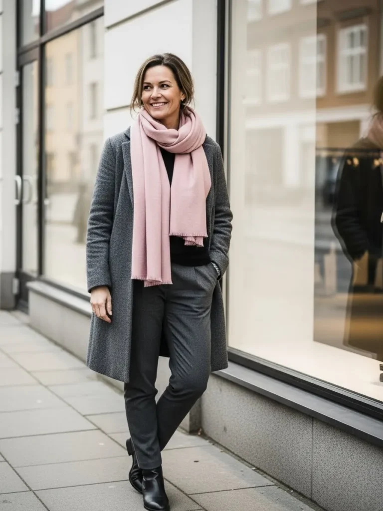 This outfit blends a gray tailored coat with slim gray trousers, a simple black top, and a soft blush scarf wrapped loosely at the neck.