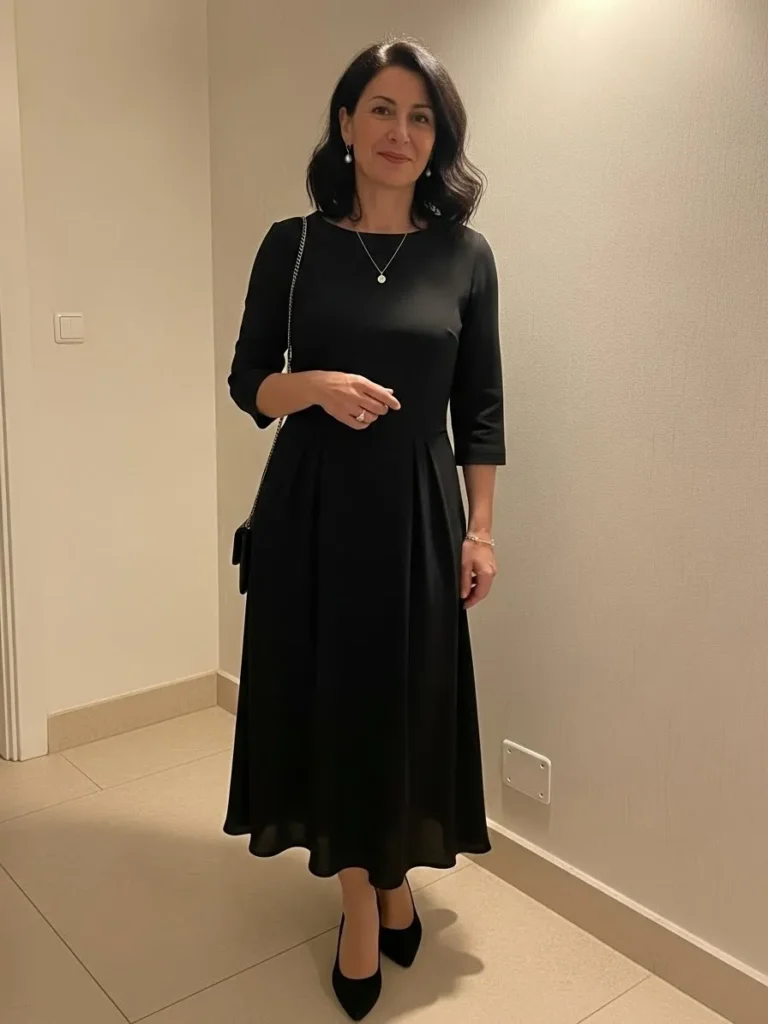 This look features a classic black midi dress with three quarter sleeves, styled with pointed heels and delicate jewelry.