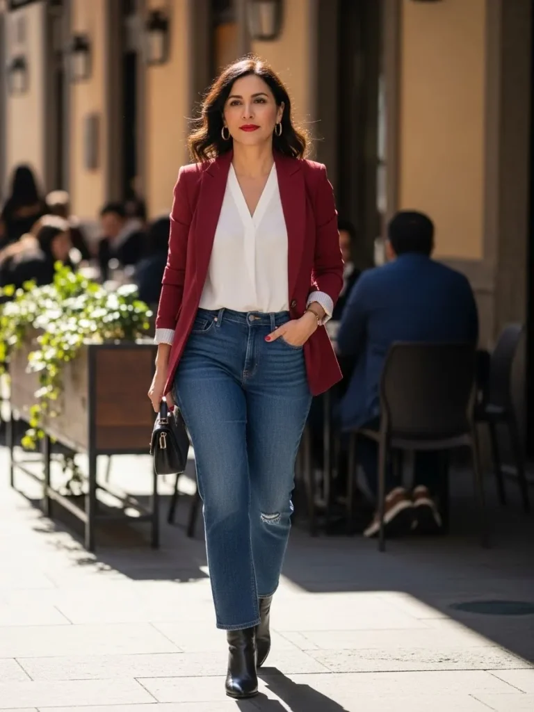A tailored red blazer is layered over a crisp white blouse and classic blue jeans, finished with ankle boots and a small structured bag.