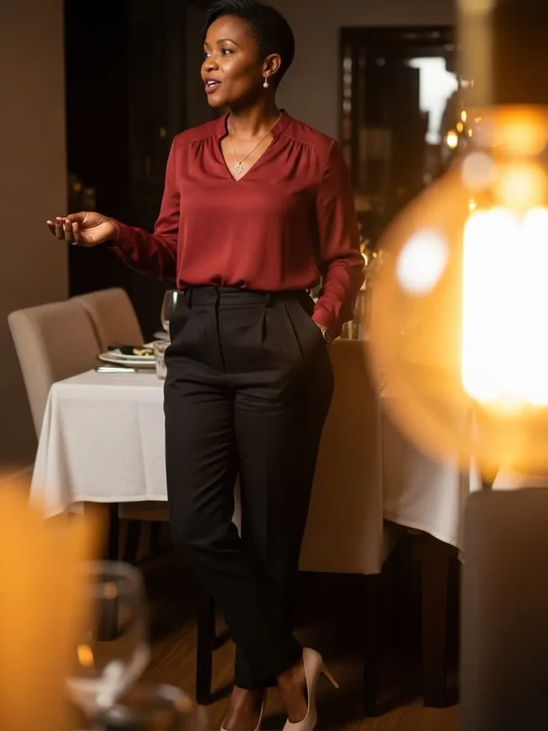 This look pairs a deep burgundy blouse with tailored black trousers and neutral heels.
