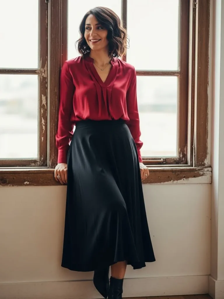 This outfit pairs a rich red satin blouse with a soft black midi skirt and simple black ankle boots.