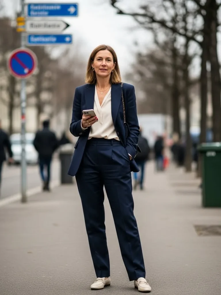 This look features a tailored navy suit styled with a soft white blouse and neutral sneakers, finished with a delicate shoulder bag.
