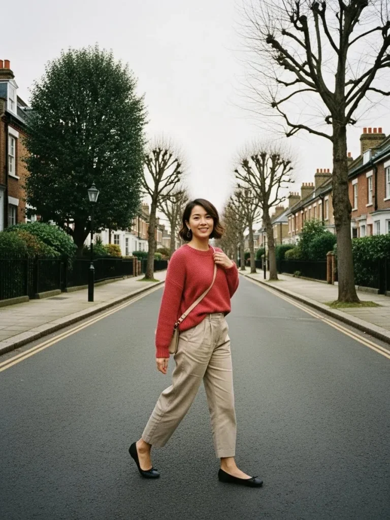 This outfit pairs a cozy red knit sweater with soft beige tailored trousers and classic black flats, finished with a simple crossbody bag.