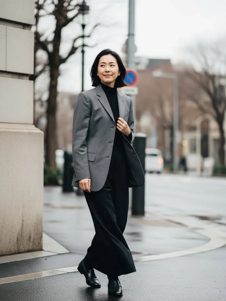 A gray blazer layered over a black top with wide leg black trousers creates a clean and modern silhouette.