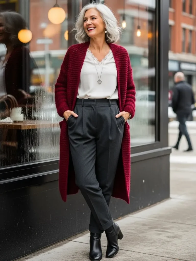A textured burgundy cardigan is layered over a creamy blouse and charcoal trousers, finished with ankle boots and delicate jewelry.