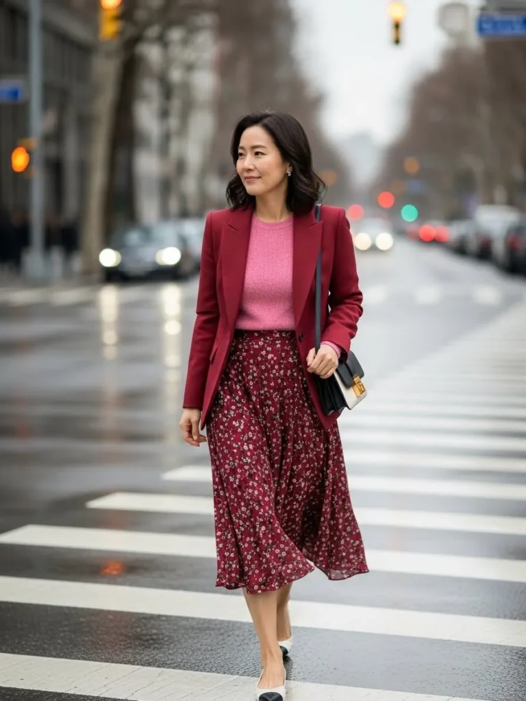 This look pairs a burgundy blazer with a pink knit top and a flowy patterned midi skirt.
