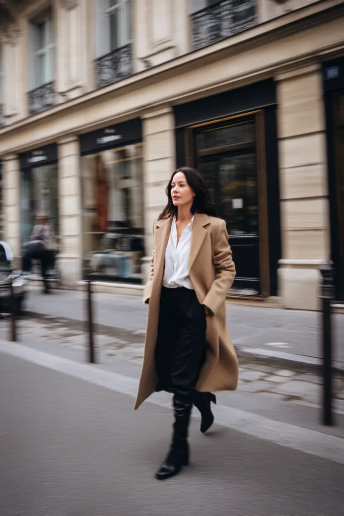 This outfit is the definition of timeless winter workwear. The woman wears a long camel coat that instantly elevates her look, paired with a crisp white blouse tucked into tailored black trousers. The black knee-high boots add polish and warmth, while the movement of the coat gives it that effortlessly chic street-style vibe. The neutral palette keeps everything sleek and professional but still cozy enough for cold mornings on the way to the office.
