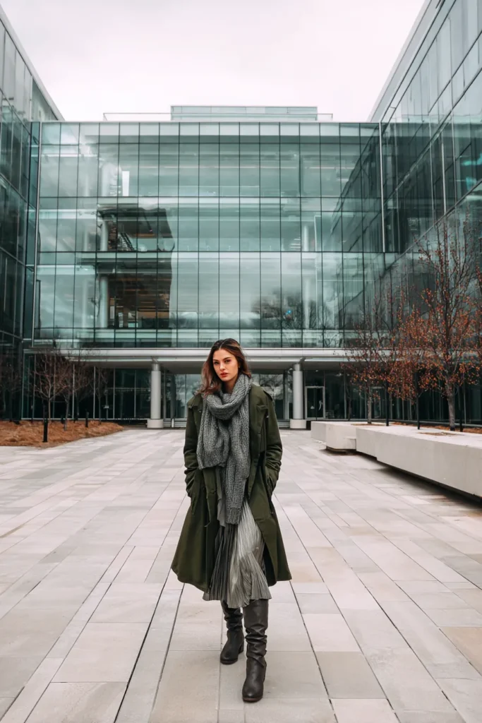This outfit strikes the perfect balance between polished and comfortable. The woman wears a long olive-green trench coat layered over a soft gray knit scarf that adds instant warmth and texture. Underneath, a pleated midi skirt in a silvery hue peeks out just enough to give the look movement and femininity. The tall gray boots ground the outfit beautifully, keeping it practical for chilly winter mornings without losing any sophistication.