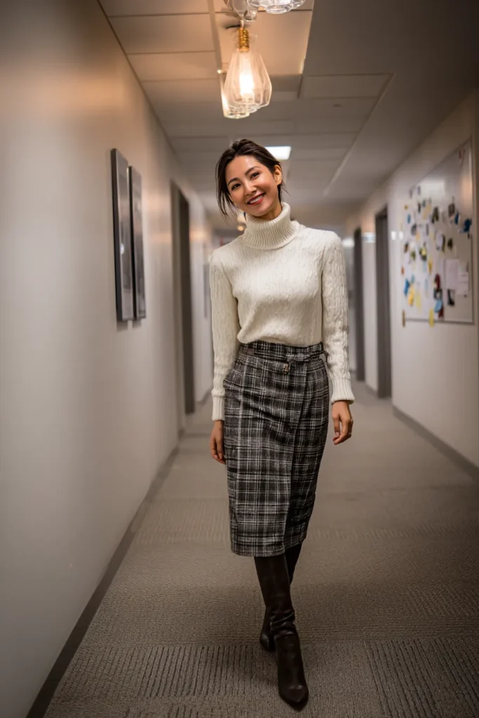 This outfit is the perfect example of cozy meets professional. The woman wears a soft cream cable-knit turtleneck tucked into a high-waisted plaid pencil skirt, creating a beautifully balanced winter office look. The brown knee-high boots pull it all together, adding warmth and polish to the outfit while keeping it practical for chilly days. The overall vibe feels classic and feminine with just the right amount of structure.
