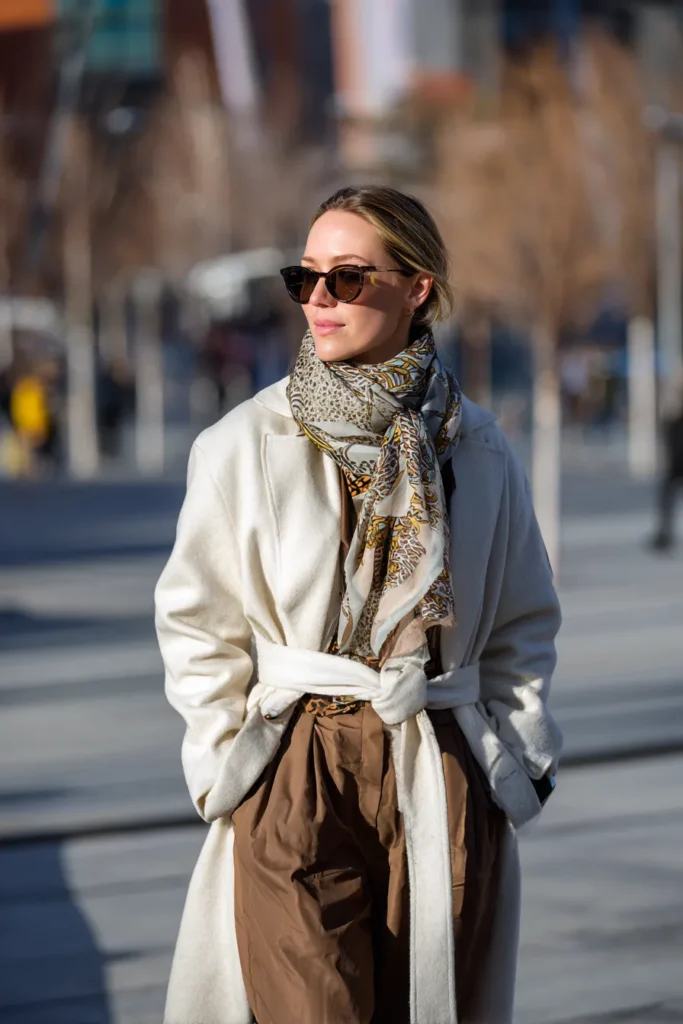This look is effortlessly chic and perfect for winter workdays when you still want to look put-together. The woman wears a soft cream belted coat that ties neatly at the waist, paired with wide brown trousers that give the outfit depth and texture. The real statement piece is the patterned silk scarf with hints of gold and beige, adding a pop of personality and refinement. Oversized sunglasses complete the look, giving it that quiet-luxury street style vibe.