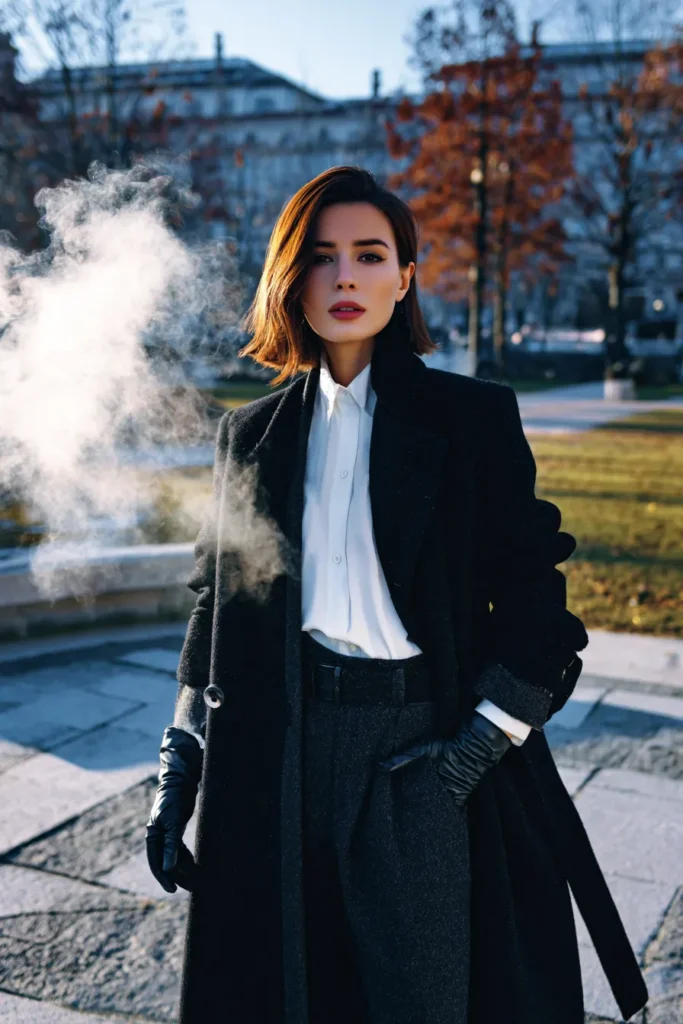 This outfit gives off that sharp, boss-energy vibe that never goes out of style. The woman wears a tailored black wool coat layered over a white button-up shirt, tucked neatly into charcoal trousers with a structured fit. The black leather gloves add a touch of polish and sophistication, while the minimal styling keeps everything clean and confident. It’s the kind of winter outfit that means business, literally.