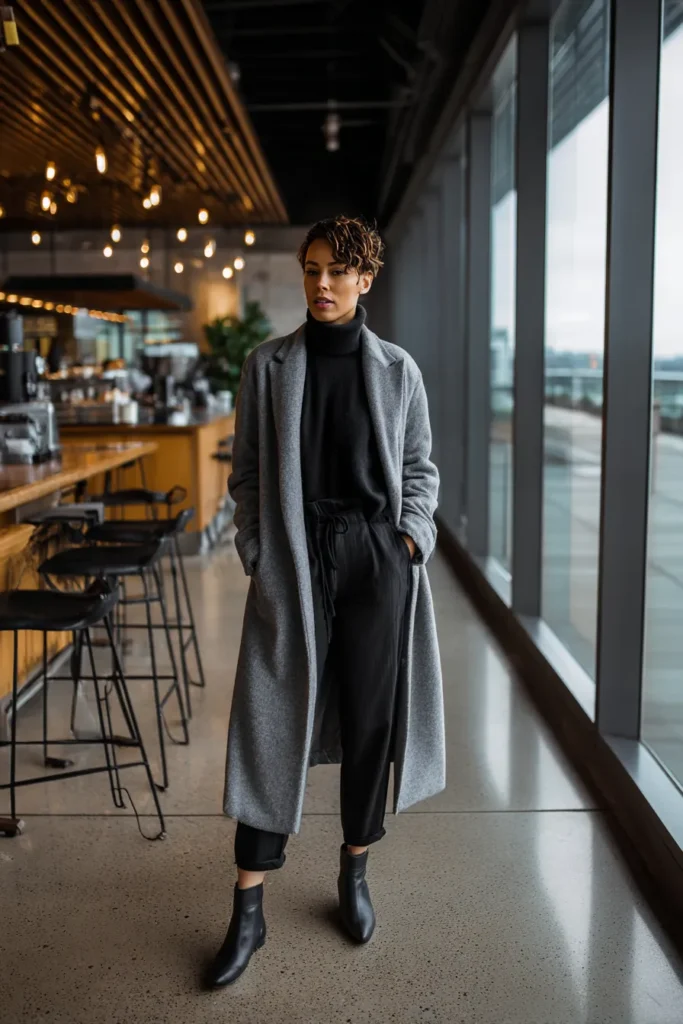 This look is sleek, simple, and seriously elegant. The woman wears a long gray wool coat layered over a black turtleneck and matching drawstring trousers that add a subtle relaxed touch. The cropped length of the pants highlights her black ankle boots perfectly, and the soft tailoring keeps the outfit refined but comfortable. The overall vibe is minimal, confident, and quietly powerful.