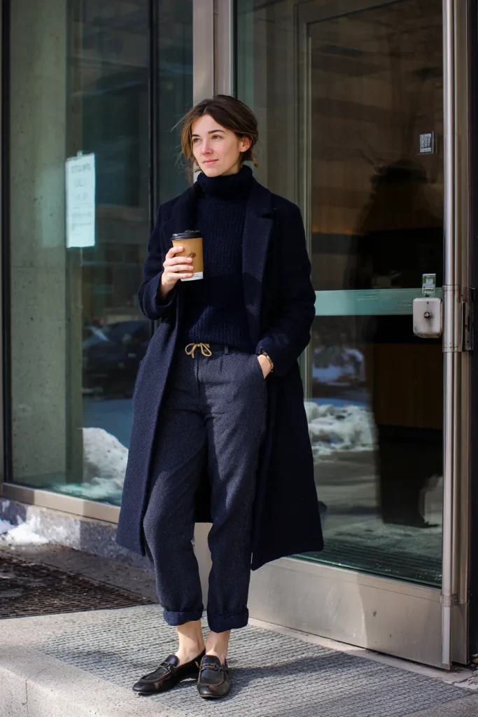 This outfit is the definition of cozy sophistication. The woman wears a chunky navy turtleneck sweater tucked into matching tailored wool trousers with a relaxed cuff at the ankle. Layered over it is a long navy coat that ties everything together into one polished monochrome look. Simple black loafers complete the outfit, giving it that perfect balance of comfort and structure.