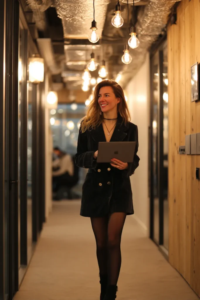 This look is the perfect mix of bold and elegant. The woman wears a structured velvet blazer dress with gold buttons, paired with sheer black tights and ankle boots. The deep, rich fabric gives a warm yet luxe texture, while the short hemline keeps the look modern and confident. The soft lighting in the background adds to the polished, after-hours work vibe that’s both powerful and stylish.