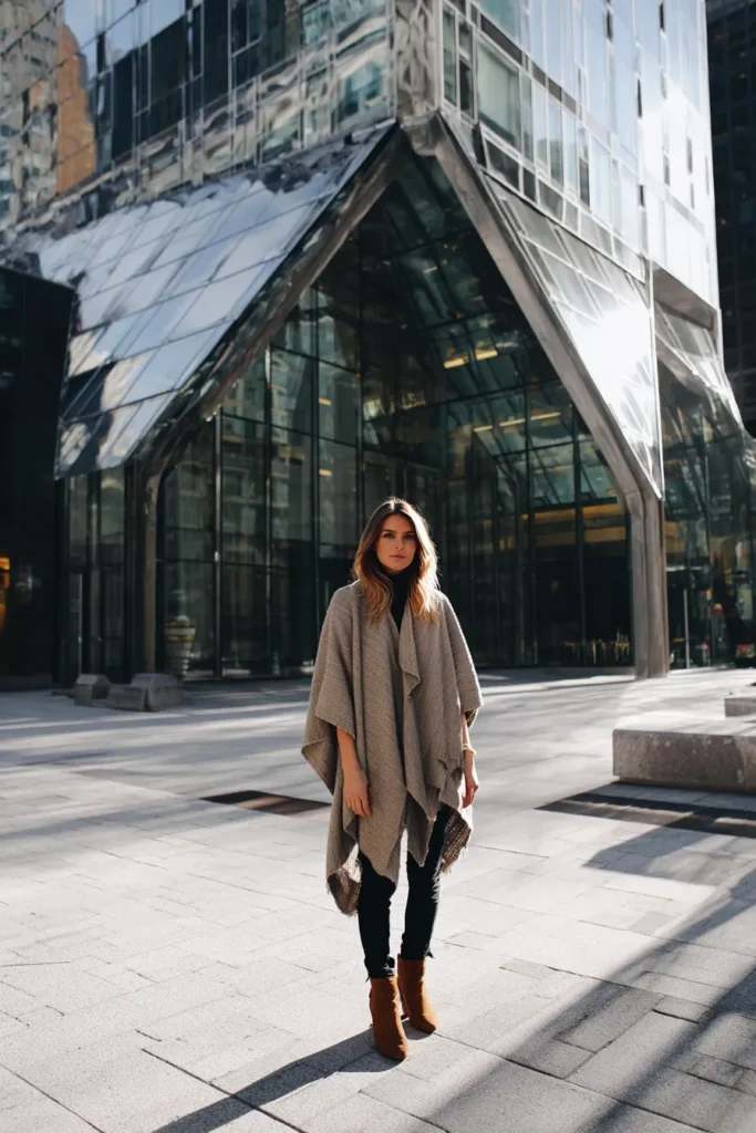 This outfit strikes the perfect balance between comfort and sophistication. The woman wears a soft, textured cape in a warm beige tone draped effortlessly over a black turtleneck and slim black pants. Brown ankle boots add a touch of warmth and polish to the neutral palette, while the overall look feels relaxed yet refined. It’s the kind of outfit that makes chilly office commutes look like a fashion moment.