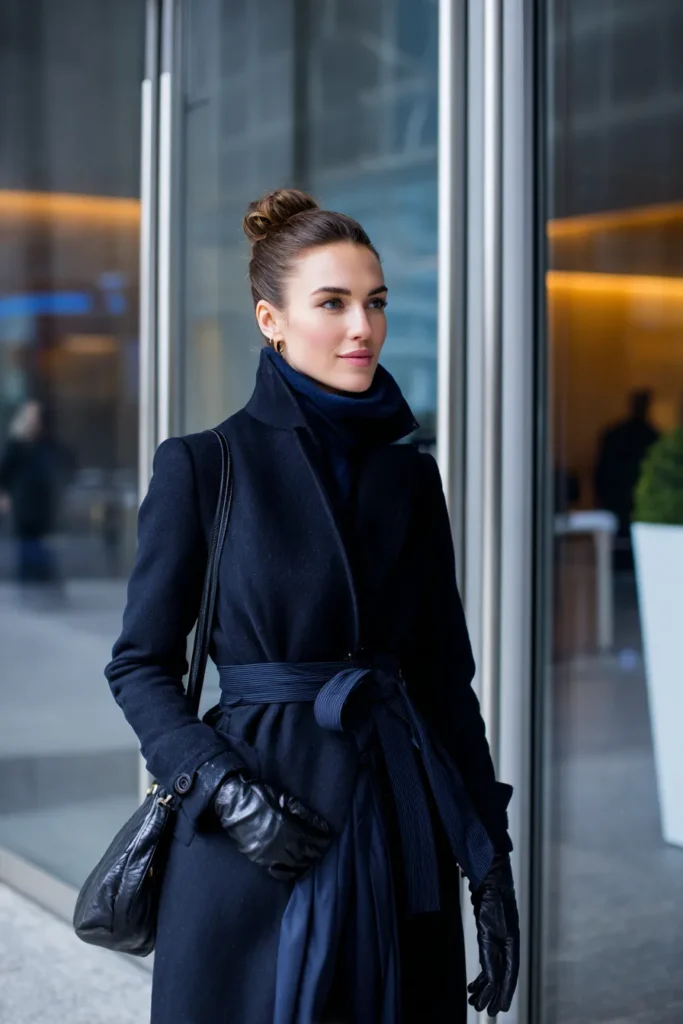 This look is pure sophistication from head to toe. The woman wears a sleek black wrap coat cinched at the waist with a belt, layered over a matching turtleneck that adds warmth without bulk. Black leather gloves and a soft leather bag complete the ensemble, while her polished bun and gold hoop earrings add a touch of understated glamour. It’s minimal, timeless, and incredibly chic—the kind of outfit that instantly commands attention.