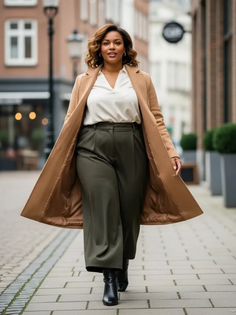 I love how this outfit creates shape without feeling restrictive. The wide leg trousers balance the silhouette while the blouse keeps everything relaxed yet refined. The camel coat adds instant elegance which is always my go to trick when I want to look put together fast. The mix of warm neutrals feels chic and flattering and the whole outfit has that effortless grown woman confidence that never goes out of style.