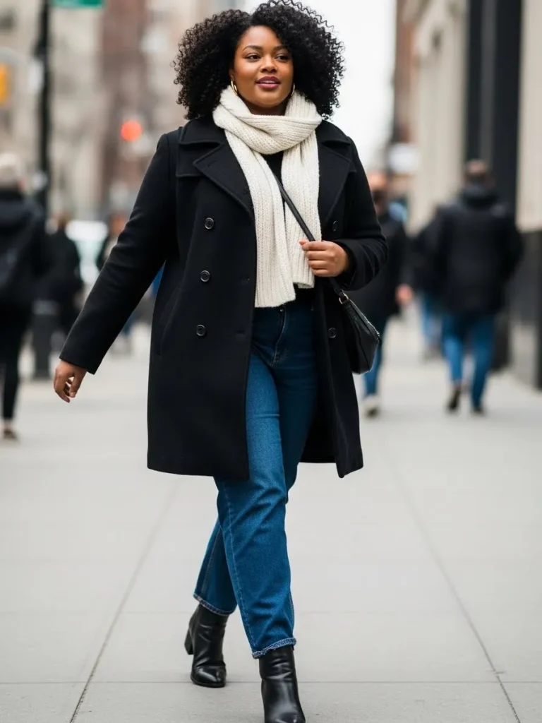 I love how balanced this outfit feels because it mixes comfort with elegance so naturally. The black coat creates such a flattering shape and the ivory scarf brightens the face in the prettiest way. I also appreciate how the jeans keep things relaxed without losing style. This is exactly the kind of outfit I reach for when I want to feel confident, warm, and put together without trying too hard.