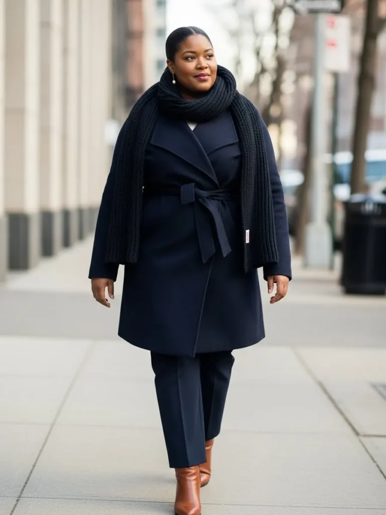 This look brings together the kind of winter polish that feels timeless and easy at the same time. She is wearing a beautifully structured navy wrap coat that ties at the waist for a flattering shape, paired with matching navy trousers that keep everything sleek and put together. The chunky navy knit scarf adds that soft, bundled up feel we all crave on chilly mornings. The warm brown ankle boots introduce a lovely contrast that brightens the whole outfit without taking away from its elegance. The vibe is clean, classic, and quietly confident.