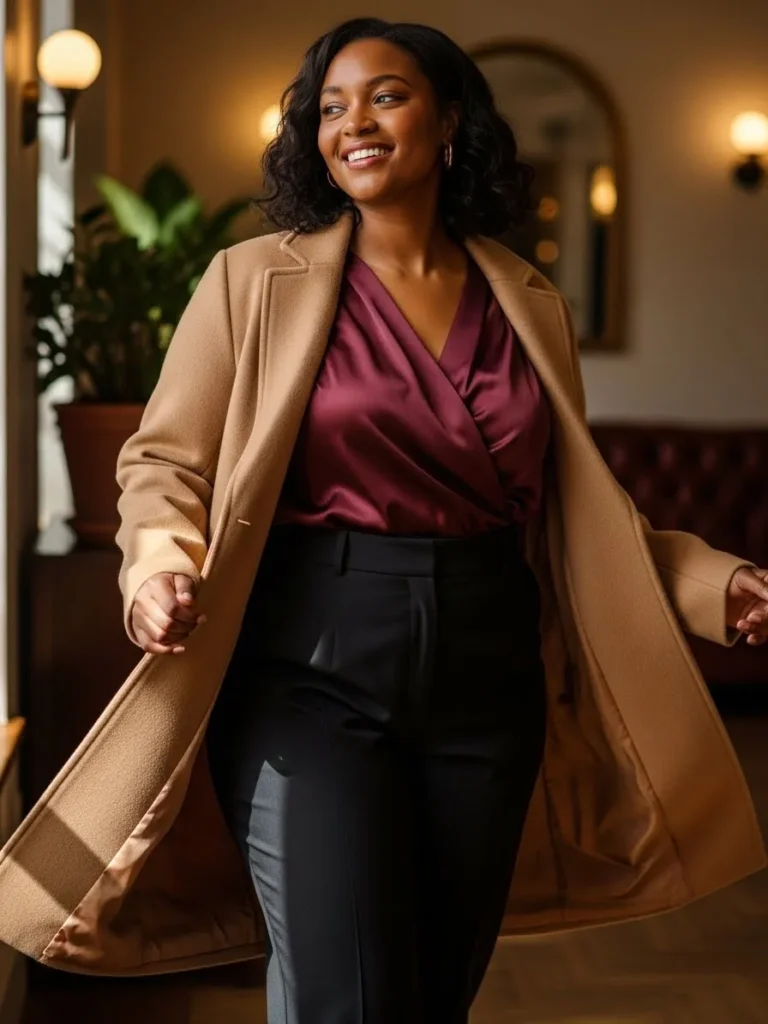 This look pairs a rich camel coat with the soft sheen of a deep plum wrap blouse and tailored black trousers. The fabrics feel luxe and winter ready with the coat bringing warmth and structure while the blouse adds that touch of silky movement. The colors blend beautifully and create a polished outfit that still feels relaxed. The overall vibe is classy with a little bit of quiet confidence which makes it perfect for work days or dressed up casual moments.