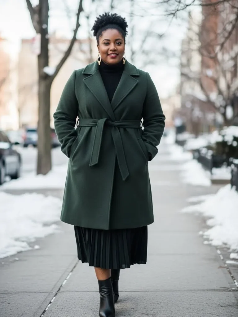 This look brings together a beautifully structured deep green wrap coat paired with a soft black turtleneck and a flowy pleated midi skirt. The coat has that rich wool texture that feels warm just by looking at it, and the tie waist creates the prettiest shape without any effort. The pleated skirt adds movement with every step while the black ankle boots keep the whole outfit sleek and winter ready. The gold earrings add a touch of glow that feels perfect for cold weather days.