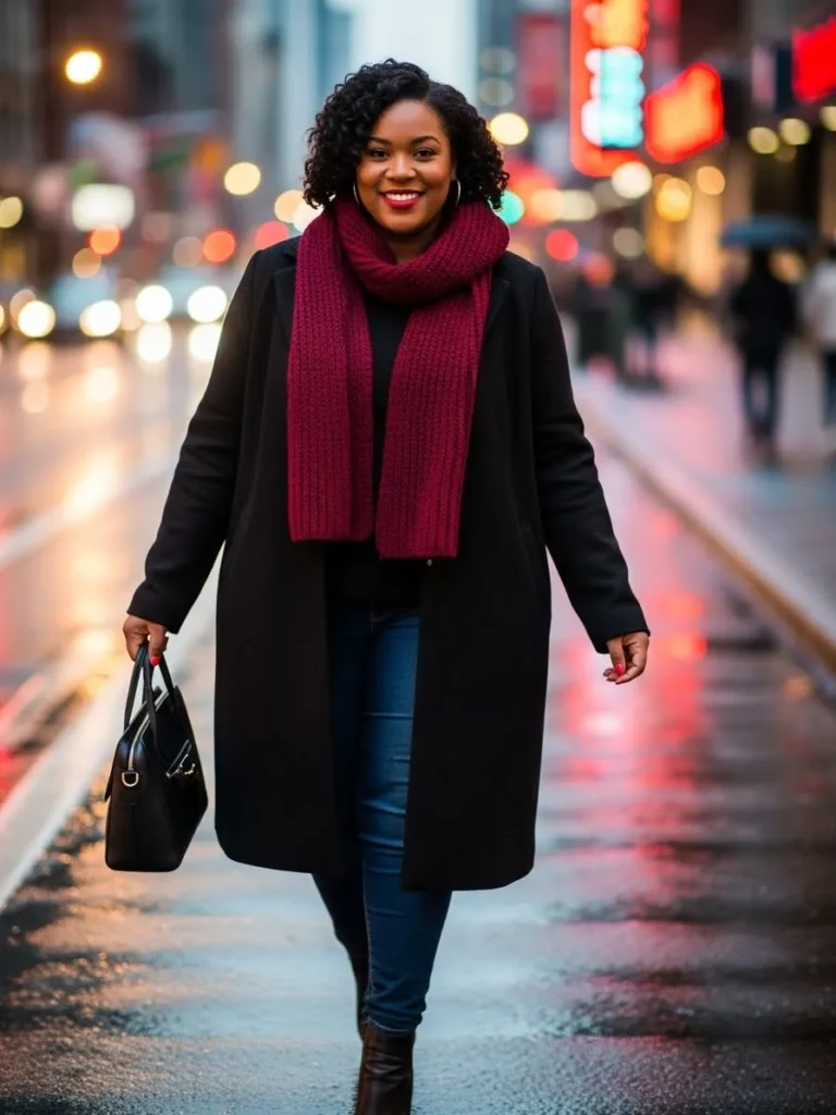 This look brings together all the winter favorites in the most polished way. She wears a long black coat that feels sleek and structured, layered over a simple dark top that keeps the outfit clean and streamlined. The deep burgundy knit scarf adds warmth and personality with its chunky texture and rich color. Paired with fitted blue jeans, ankle boots, and a classic black handbag, the vibe is effortlessly chic. The city lights reflecting on the wet street make the whole outfit feel even more stylish and modern.