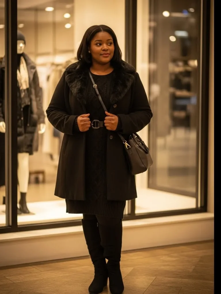 This look is all about quiet luxury in the coziest way. She is wearing a beautifully tailored black coat with a soft faux fur collar that instantly adds that rich winter energy we all secretly adore. Underneath, the black knit dress keeps things sleek and warm without feeling bulky. The matching black crossbody bag tones everything together perfectly while the black knee-high boots give the whole outfit a polished finish. The vibe feels softly glamorous yet totally wearable for real life, especially with the warm indoor lighting giving her outfit that gentle glow.